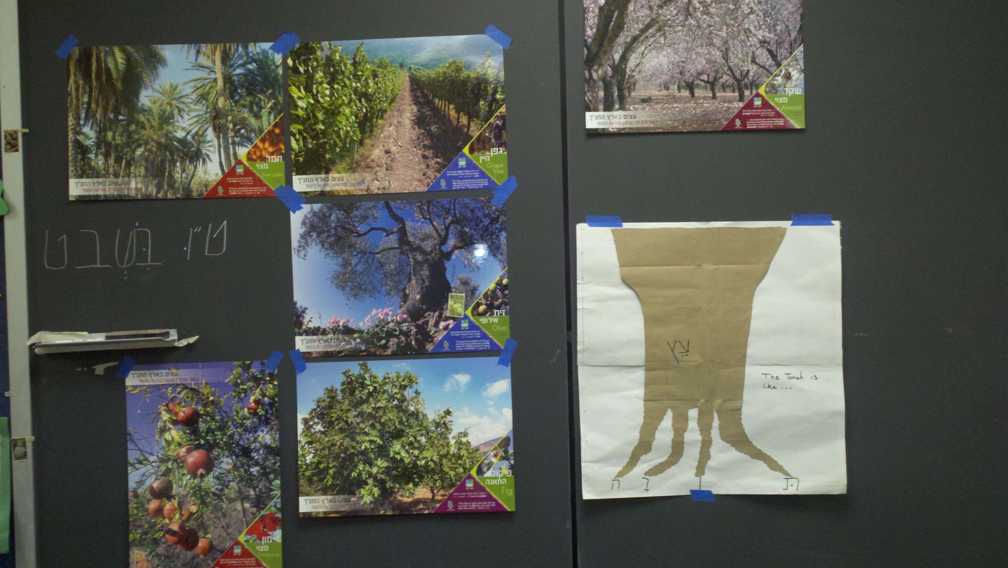 In a previous post (“Take A Cue From The Zoo” 1/29/12), I mentioned that I was planning a Tu B’Shvat celebration for Kitah Gimel and hoped to make it a memorable sensory experience. Tu B’Shvat came. We celebrated with a gala Tu B’Shvat Seder. Was it multi-sensory? I’d say, “Yes!” – colorful JNF posters to see around the room; a chance for each student to read aloud a portion of the Seder “Haggadah” and to hear classmates read; lots of fruits and treats to touch and taste, plus grape juice mixtures from white to ruby red to drink. The following is a detailed description of our Seder that I also posted on the synagogue’s religious school website. Your comments are welcome as well as descriptions of your Tu B’Shvat celebration at school or at home. Shalom Kitah Gimel students and families! Olives and raisins and dates, oh my! Students arrived in class to find their tables covered in shades of green and an array of fruits and cookies in place of our usual “on-time” Oreos. Birthday napkins at each place gave a further clue that this was no ordinary day. It was Tu B’Shvat (the 15th of the Hebrew month of Shvat) and Kitah Gimel was about to participate in a Tu B’Shvat Seder. We began as always with students leading the Blessings. Why the Blessing for Torah study at a Tu B’Shvat Seder? One student pointed out that the Torah is called the “Tree of Life”. The Shehechayanu Blessing was certainly appropriate as we gathered to celebrate a special holiday. A Seder requires a Haggadah. Each student received a Haggadah booklet adapted from the JNF (Jewish National Fund) Haggadah, “Branching Out”. Students also received a booklet of additional information about Tu B’Shvat. We discovered that trees were given a “birthday” in order to determine their ages for the fulfillment of certain religious rituals described in the Torah. The concept of a Tu B’Shvat Seder was created by the Kabbalists who believed that we learned important lessons about ourselves from trees. You can’t have a Seder without The Four Questions. For Tu B’Shvat the four questions centered on inquiring about eating fruits that grow in Israel, conserving and sharing natural resources, and planting. The format of the Seder reflects the Kabbalistic idea that “we live on four levels at the same time”. The first level, Assiyah, is the level of actions that we take. The second level, Yetzirah, is about “energy and feelings”. The third level, Briyah, focuses on “ideas and creativity”. The fourth level, Atzilut, is the level of “spirituality and closeness to God”. As we moved through the levels in the Seder ceremony, we ate fruits associated with the first three levels and drank a mixture of red and white grape juice, whose color varied from white (symbolizing winter)
